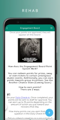 The Another Chance Rehab App is for anyone who wants to take their recovery to the next level. This app is loaded with so many resources and will give you tools and support as you advance in your recovery journey. Earn badges and points as you compete with your friends when you put action into your recovery! The App includes gamification features that encourages engagement and allows you to make recovery challenging, yet fun.