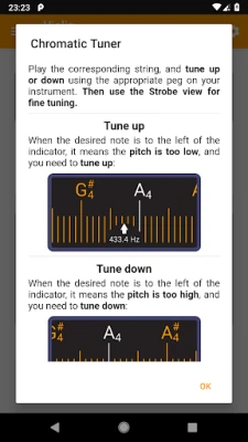 The chromatic tuner precisely detects the frequency of the tone played on your instrument, and shows it on the chromatic scale. The target pitches are highlighted on the scale, and you can see how much is the tone out of tune. When you get close enough, you can use the strobe tuner for fine tuning.
